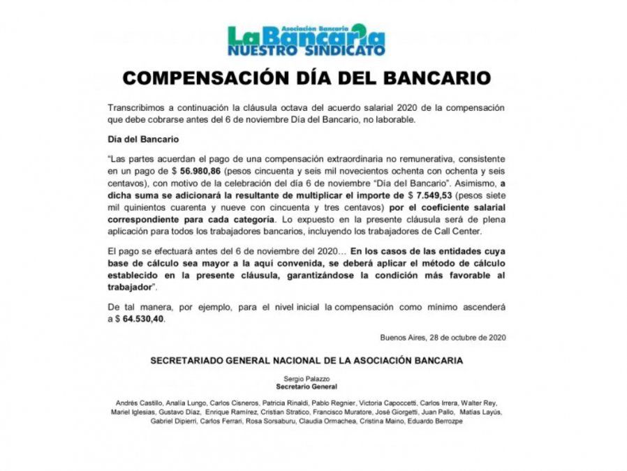 La cláusula octava del acuerdo salarial 2020 determinó que esa compensación por el "Día del Bancario" implica el pago de 56.980,86 pesos, informaron hoy en un comunicado de prensa los dirigentes Sergio Palazzo y Eduardo Berrozpe.