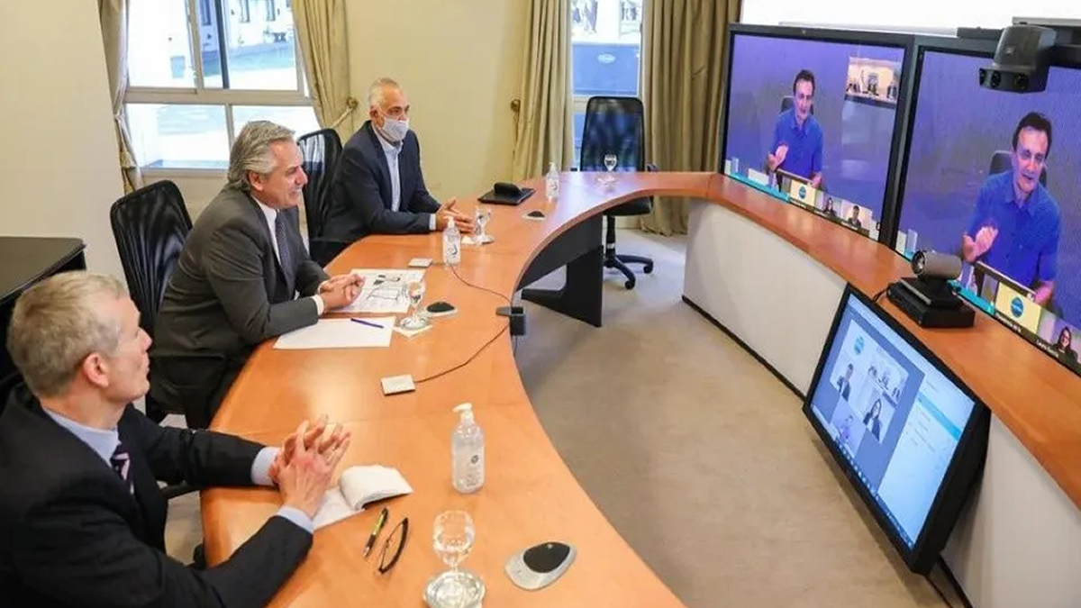 El presidente Alberto Fernández se comunicó desde la residencia de Olivos mediante videoconferencia con Pascal Soriot, CEO global del laboratorio AstraZeneca, que desarrollará en Argentina el principio activo de la vacuna contra el coronavirus para América Latina a partir del primer trimestre de 2021.