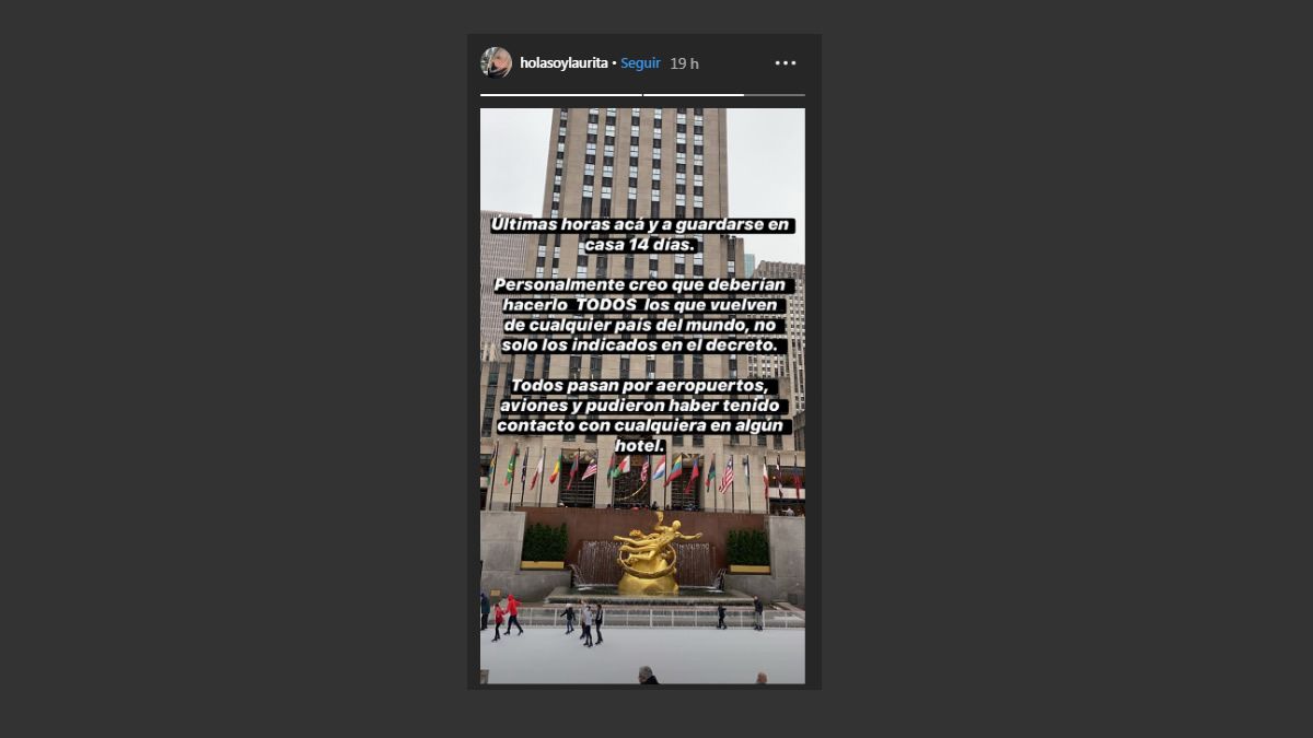 Desde su cuenta oficial de Instagram, Laurita Fernández (29) hizo referencia a la problemática mundial del COVID-19 o Coronavirus y expresó que una vez que llegue a la Argentina, cumplirá con los 14 días de aislamiento indicados en el nuevo DNU por el Gobierno Nacional. En los últimos días, la actriz estuvo de vacaciones en Nueva York junto a su mejor amigo y no dudó en avisar que se pondrá en cuarentena al arribar.