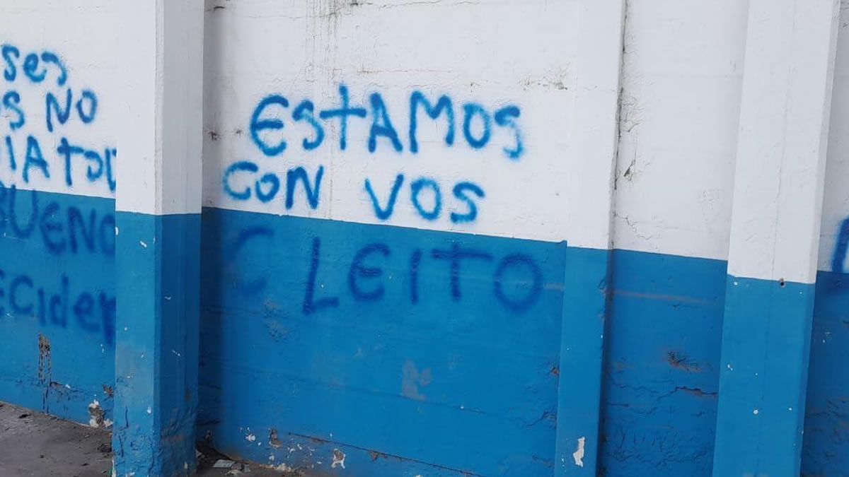 "Estamos con vos, Leito", expresa otro de los grafitis plasmados sobre los muros del Monumental. Las imágenes de las pintadas se hicieron virales rápidamente, y fueron motivo de discusión también en las redes para los hinchas "decanos".