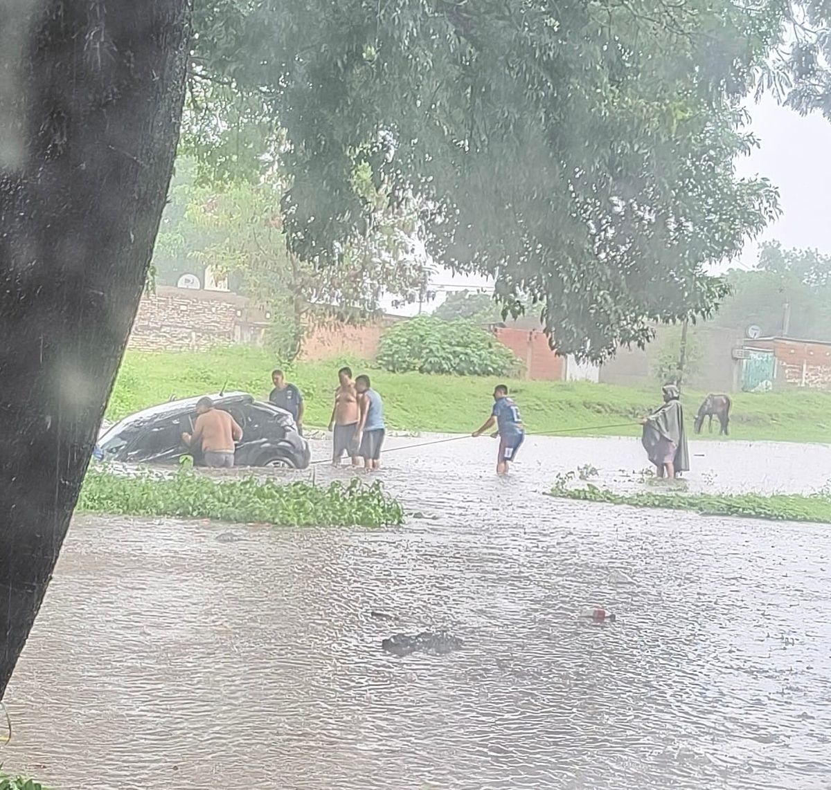 Producto de las lluvias en la capital tucumana, un auto quedó atrapado en el agua en la calle Suipacha al 1.400.