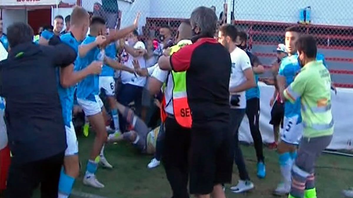 Cuando debían regresar al vestuario y tras dedicarle varios insultos al árbitro, jugadores de Belgrano se toparon con algunos del local y hasta personal de seguridad y hubo trompadas y empujones.