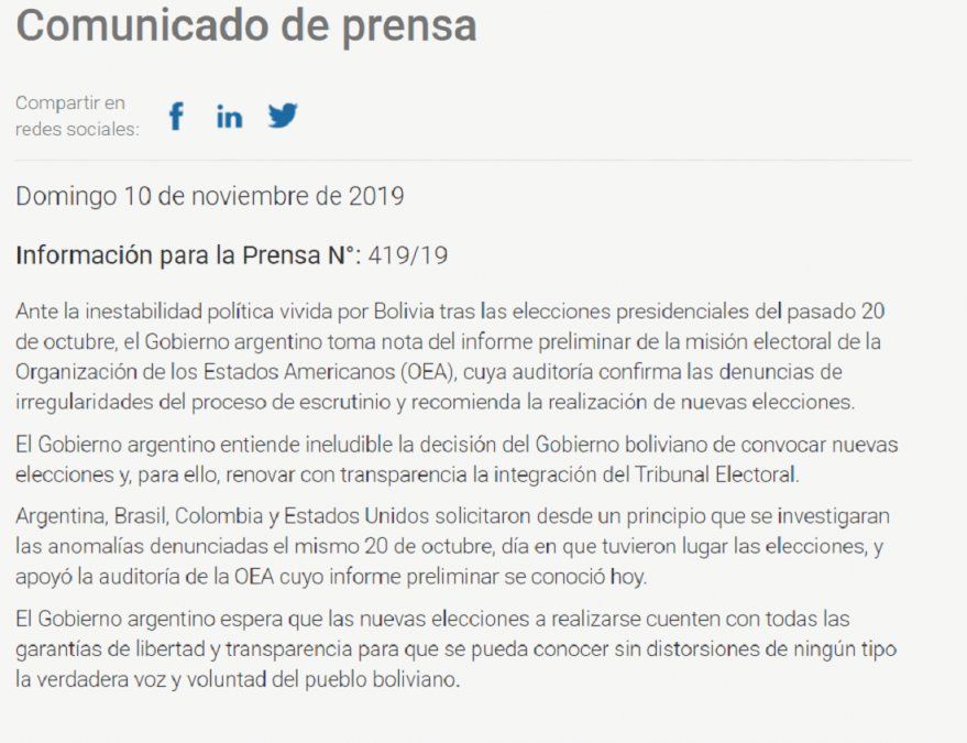 En el marco del estallido social ocurrido en Bolivia y concretado con la renuncia de Evo Morales del gobierno boliviano y una denuncia conjunta por un golpe de estado, la esperada manifestación del gobierno de Mauricio Macri llegó con un comunicado por medio de la Cancillería.