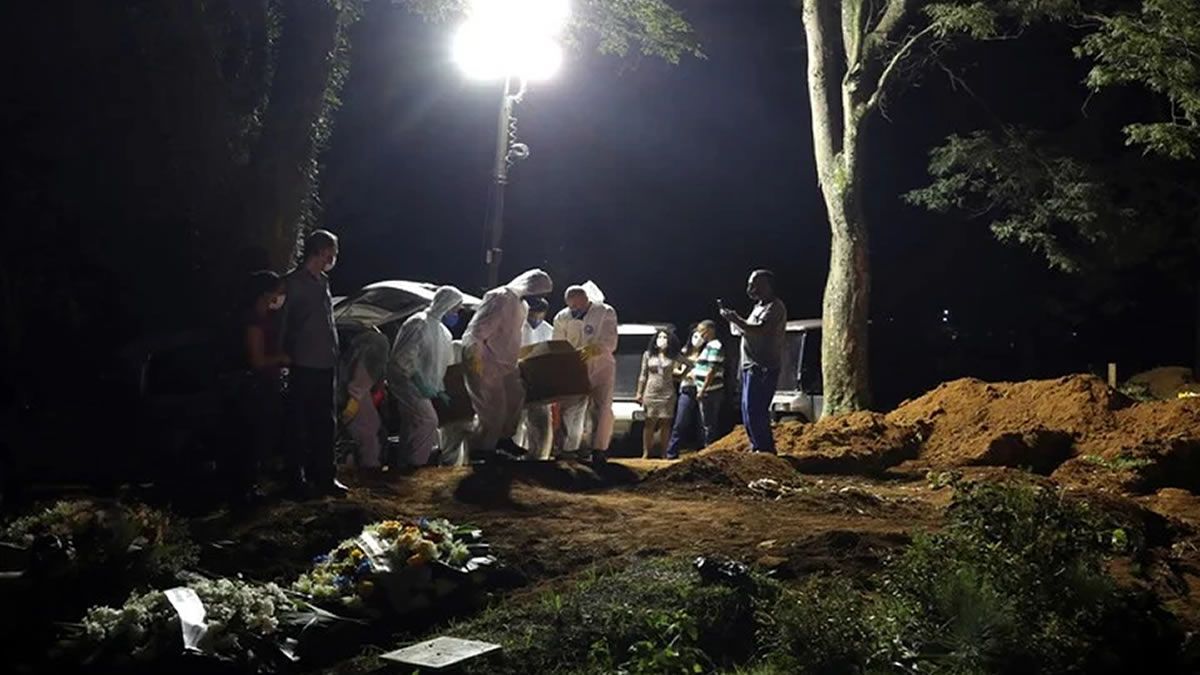 En Sao Paulo, los familiares se reúnen alrededor de los focos que iluminan el agujero en la tierra que anuncia el turno del sepelio entre los sonidos de los llantos y las oraciones. Los trabajadores funerarios ataviados con EPI introducen los féretros rápidamente para después taparlos con tierra y continuar con el siguiente.