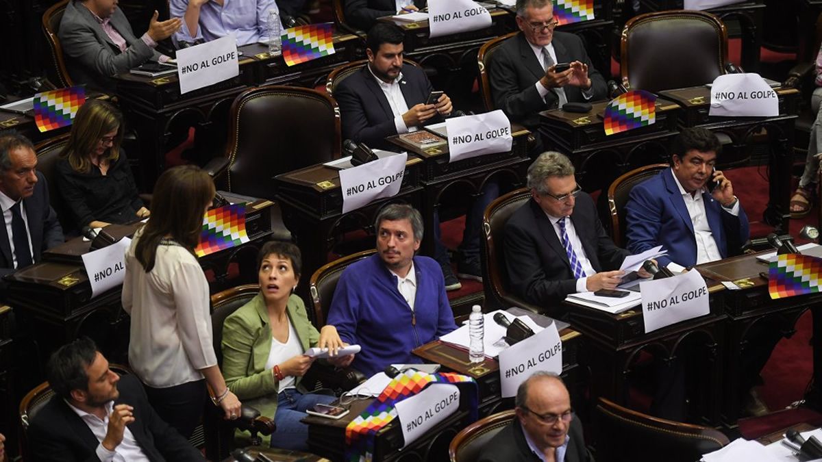 Luego de un largo debate en ambas Cámaras, de cinco horas, el peronismo logró aprobar en el Congreso sus proyectos de repudio al “golpe de Estado” en Bolivia. Tanto en Diputados como en el Senado, los documentos no fueron acompañados por Cambiemos. En el la Cámara alta, el PRO votó en contra y la UCR se abstuvo, mientras que en la Cámara baja todo el oficialismo se abstuvo con excepción de Daniel Lipovetzky, que votó a a favor del texto del PJ.