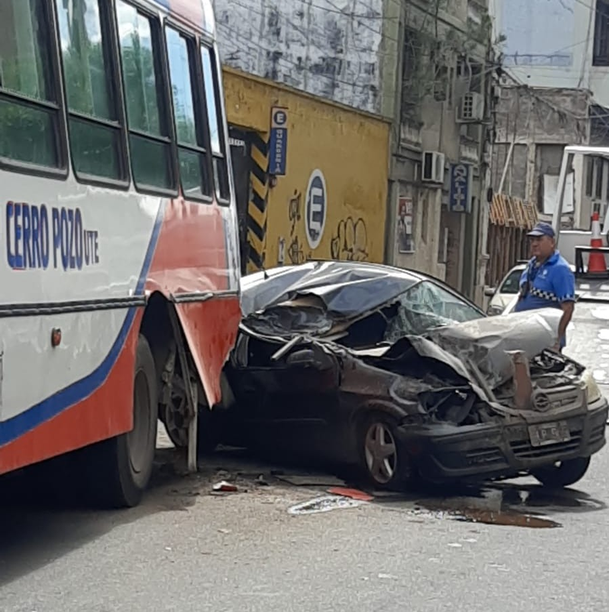 "El coche paró para que desciendan los pasajeros y el auto lo tragó al colectivo. Fue un golpe muy fuerte. Aparentemente se durmió", relató un compañero del chofer al móvil de LV12.