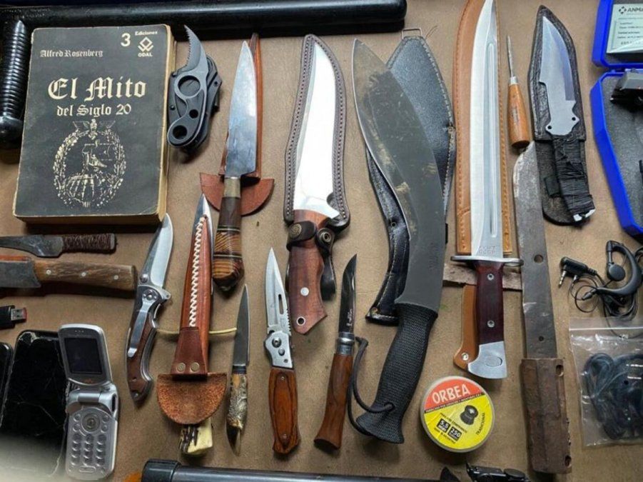 Durante los allanamientos se secuestraron una decena de armas de fuego cortas y largas, armas blancas -algunas de las cuales ya habían sido identificadas en fotografías en redes sociales-, radios, literatura nazi y objetos con identificaciones de grupos de odio. Además se recabaron dispositivos digitales como celulares, computadoras y memorias que serán objeto de peritajes.