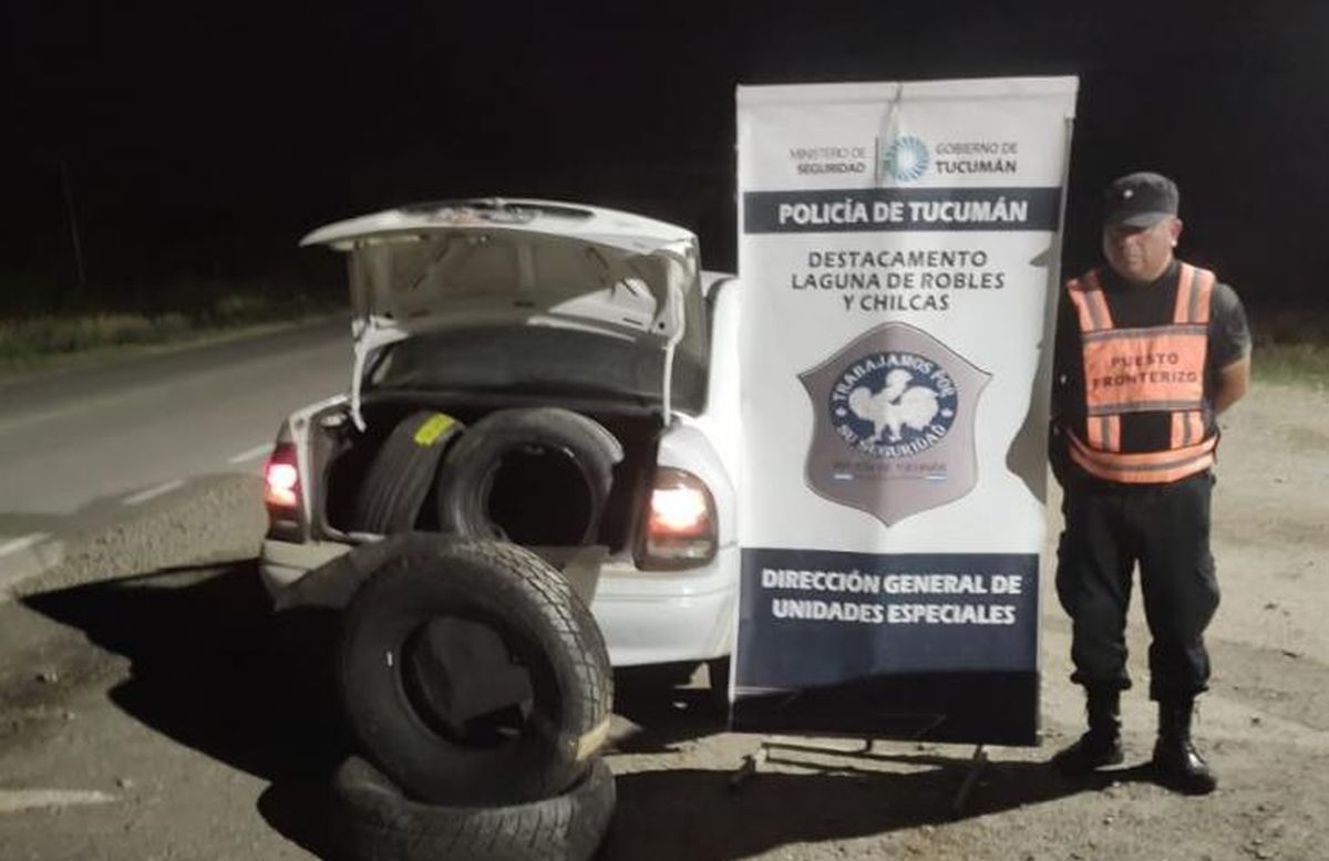 El procedimiento tuvo lugar en el Destacamento Fronterizo Laguna de Robles, donde efectivos policiales detuvieron la marcha de un vehículo que provenía desde la provincia de Salta. Al inspeccionar el rodado, constataron que el conductor transportaba una importante cantidad de neumáticos y mercadería de origen importado, sin la documentación exigida por la normativa vigente.