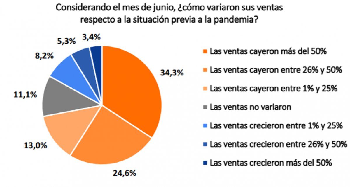 Mientras que, al ser consultados sobre la variación de las ventas de junio respecto a la etapa previa a la pandemia, el 34,3% dijo que cayeron más del 50%, el 24,6% afirmó que retrocedieron entre 26% y 50% y el 8,4% afirmó que crecieron hasta 25%.