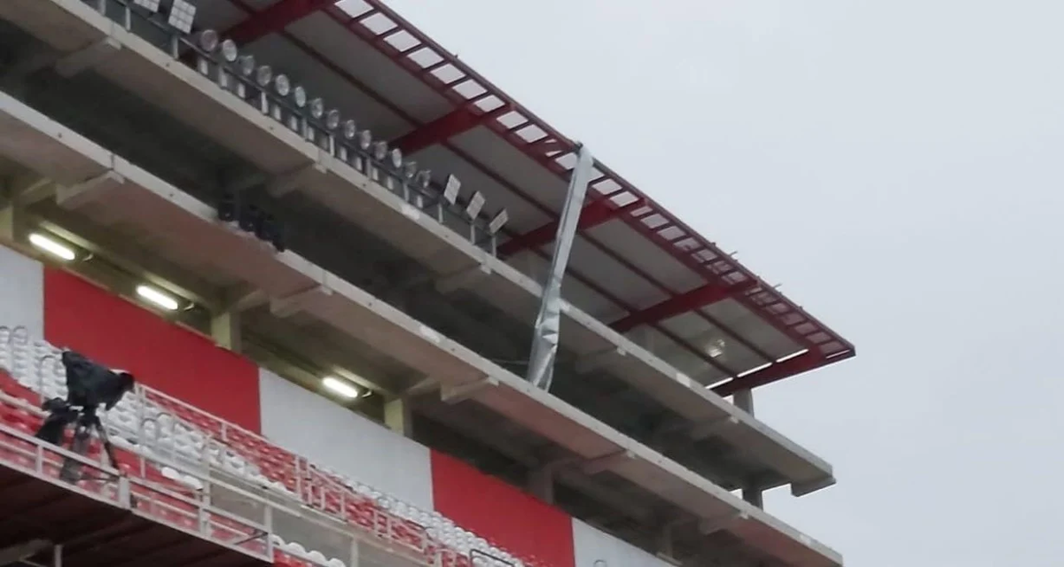 Las autoridades le dieron 20 minutos al Tatengue para solucionar el problema: tenían que cortar una chapa del techo que sobresalía. El resto del material, en tanto, se desprendió sobre el lugar de trabajo de un camarógrafo. Por suerte, no hubo heridos.
