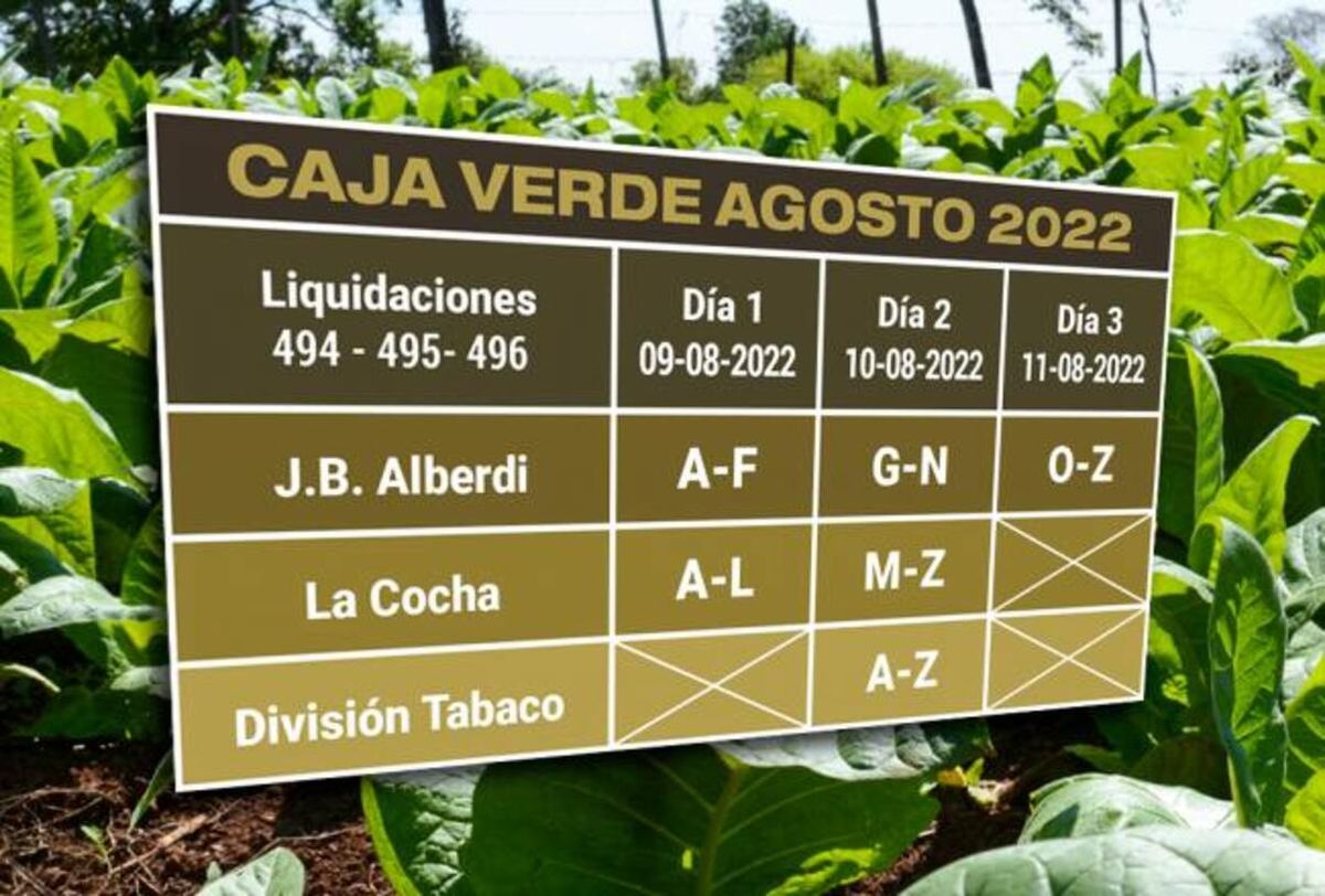Desde la Secretaría de Estado de Desarrollo Productivo se informó a través de la División Tabaco que desde el 9 y hasta el 11 de agosto se abonarán $40 millones de la denominada Caja Verde del Fondo Especial del Tabaco (FET) al sector tabacalero tucumano, según el siguiente cronograma.