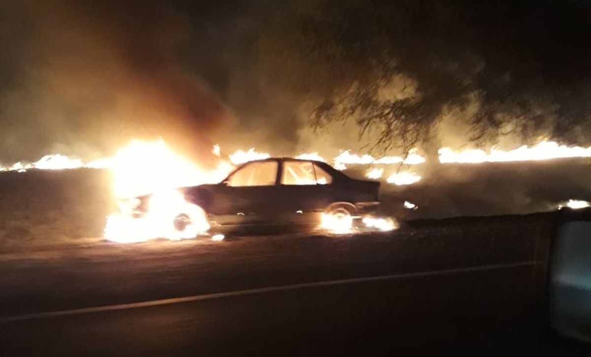 Esta noche, un automóvil se incendió en la Ruta Nacional 9, a la altura de Choromoro. Testigos capturaron el impactante momento en que las llamas envolvieron por completo el vehículo, propagándose brevemente a la vegetación seca circundante.
