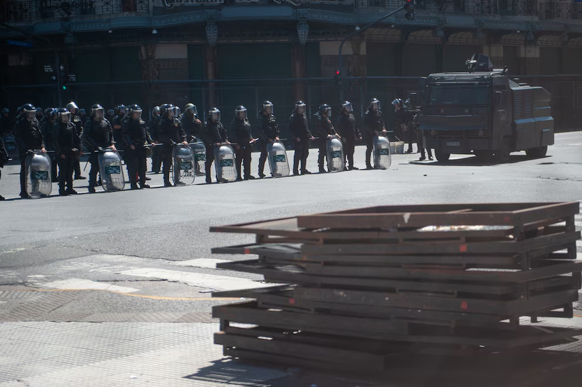 Las filas policiales cortaron el tránsito en las inmediaciones, en cumplimiento del protocolo antipiquetes, mientras los militantes se apostaban en la Plaza Congreso.