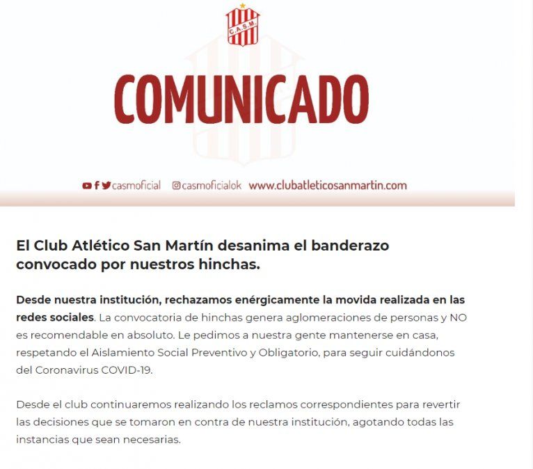 La dirigencia de San Martín emitió este martes un comunicado en el que rechaza "enérgicamente la movida realizada en las redes sociales. La convocatoria de hinchas genera aglomeraciones de personas y no es recomendable en absoluto", en torno a las medidas que rigen para detener la propagación del coronavirus en Tucumán.