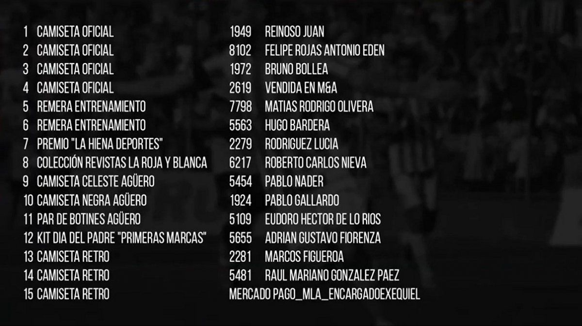 La promesa de los sorteos de camisetas, botines, kits y otros elementos se vio reflejada llegando al cierre con el anuncio de los 15 ganadores a través de una placa, los cuales serán supervisados y entregados de forma correspondiente "vía escribano".