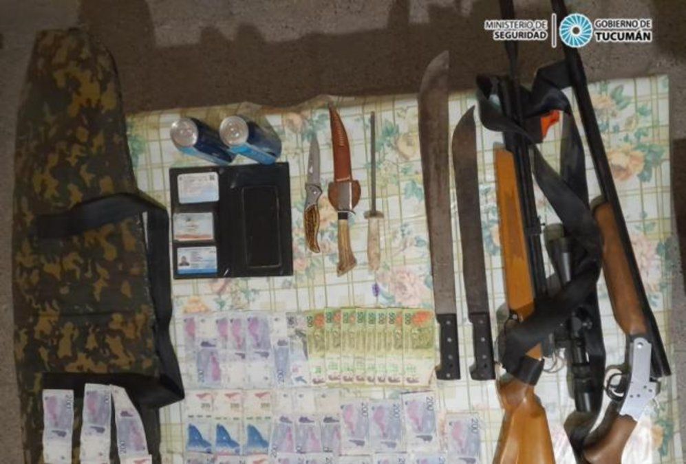 Tras la pericia de esta Unidad Especializada se produjo el hallazgo de una escopeta calibre 12/70, un rifle calibré 22, dos machetes, una navaja, una lima, dos latas de cerveza, además de 10.000 en efectivo.