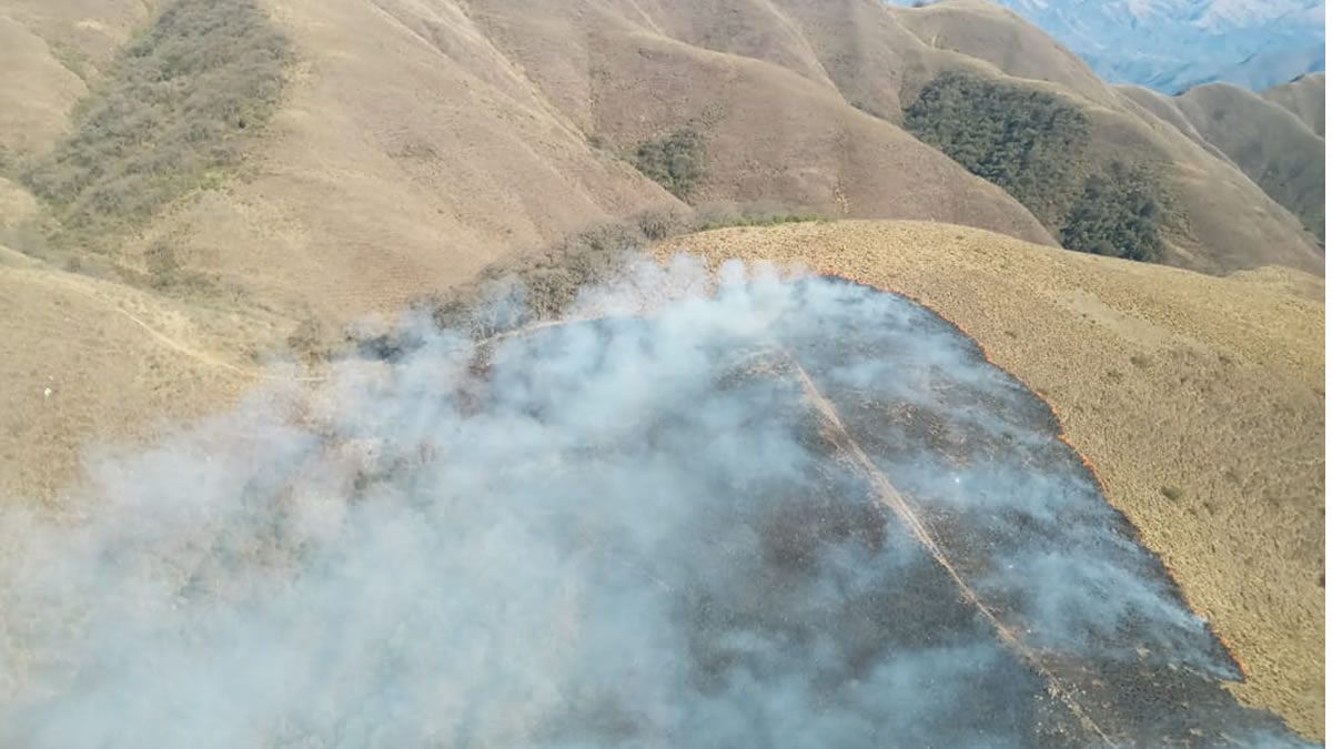 “Hay vientos muy intensos. El pajonal está muy alto. Tiene un metro de altura y está muy seco. Es muy difícil de apagar. Hay lugares de muy difícil acceso por las pendientes. Se controlan algunos frentes para que no avance. Hoy se contaría con un avión hidrante del Plan Nacional del Manejo del Fuego que operará desde la finca San Vicente ubicada a 17 kilómetros. Desde allí haremos la provisión de agua” y observó que las previsiones meteorológicas no son buenas para las próximas horas.