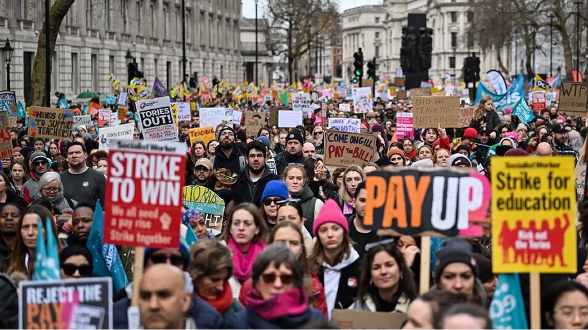 Cientos de miles de maestros, profesores universitarios y trabajadores de la administración pública junto a los ferroviarios que han mantenido el país en vilo en los últimos 8 meses, saturaron las calles de las principales ciudades de Inglaterra para exigir un incremento salarial que empate o gane a la inflación y una derogación del proyecto de ley laboral para restringir aún más el derecho a la huelga en el país.