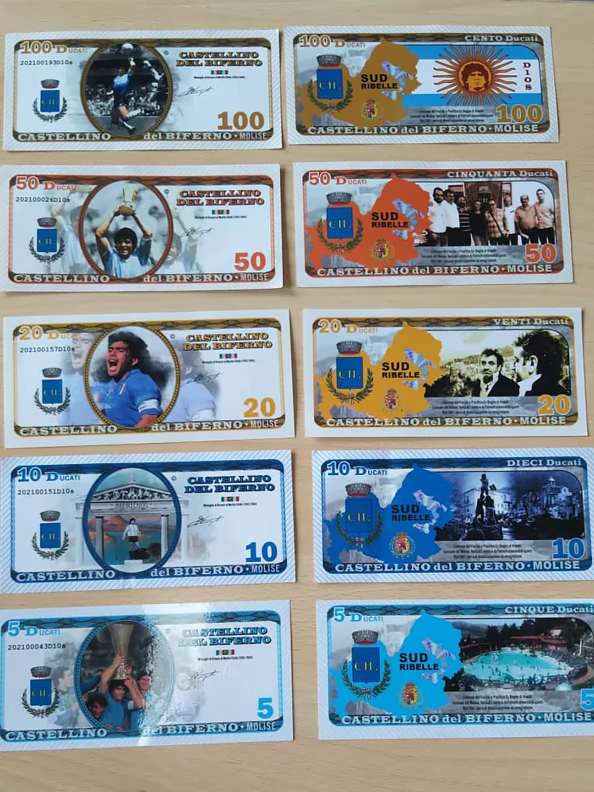 “Con el asesinato de Maradona -Fratangelo no dice muerte-, las cosas cambiaron porque era y sigue siendo un icono del mundo latino y, por tanto, del humanismo, que siempre ha luchado contra los poderes del capitalismo y del neoliberalismo ligado a la globalización de los ingresos pero no de los derechos de los pueblos oprimidos”. El alcalde decidió inmortalizar sus momentos de gloria en el dinero. La moneda de dos ducados retrata la imagen de Maradona durante el himno de la final del Mundial de 1986. La moneda de diez ducados tiene el valor envuelto en la palabra dios, el sol de la bandera argentina, la fotografía del pueblo en la colina, el rostro del futbolista con una corona, dos halos de laureles y el término Merid10s, un concepto que además de darle nombre al instagram del síndico y a la plataforma virtual del pueblo, mezcla la divinidad con el número maradoniano y el meridionalismo, la ideología que representa las causas sociales del sur de Italia.
