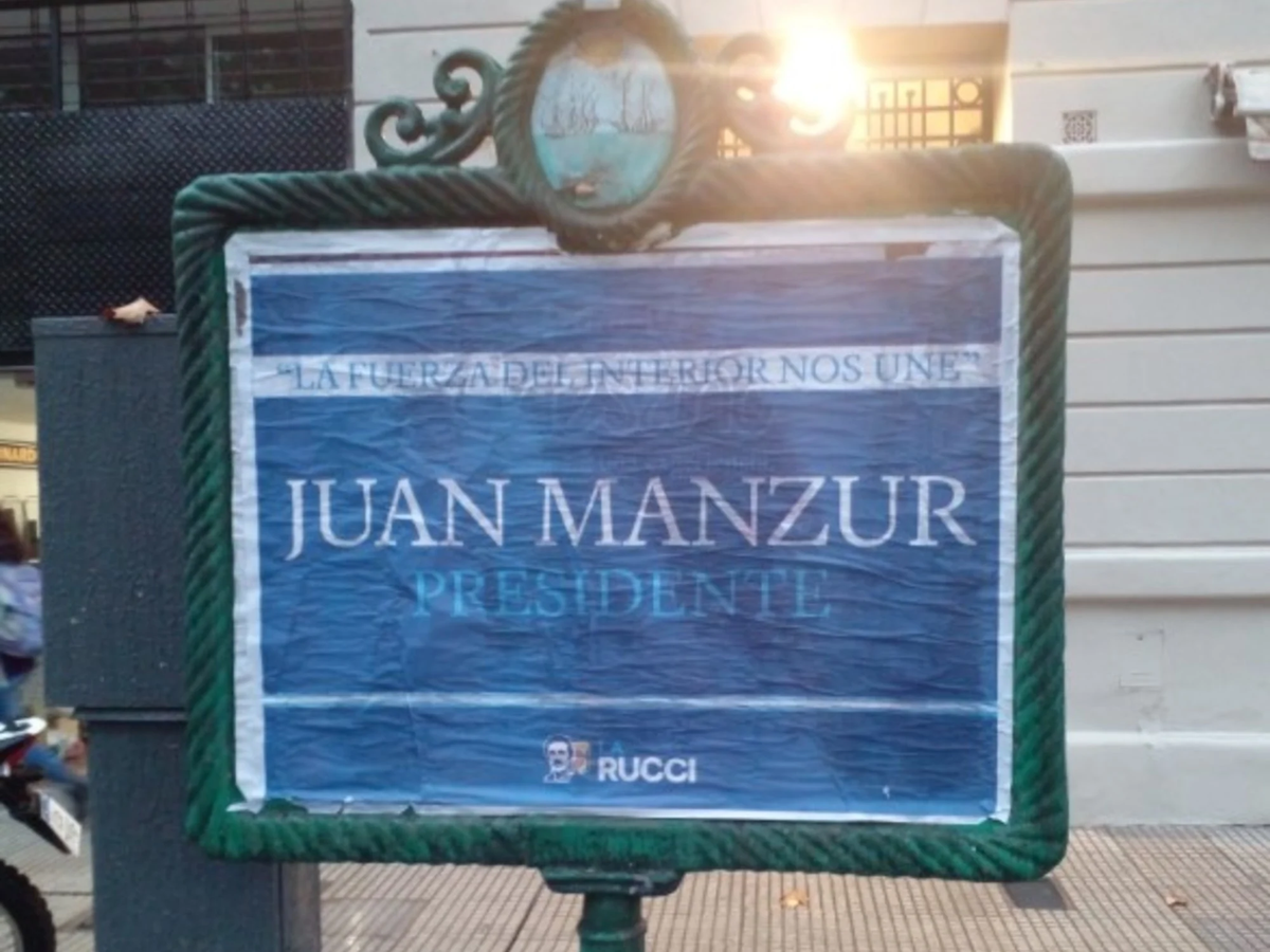 "La fuerza del interior nos une. Juan Manzur Presidente", dicen los carteles realizados en la gama del celeste y blanco, que son firmados por la agrupación La Rucci, que fueron pegados en la cartelería a lo largo de la avenida de Mayo y Belgrano, entre otras principales arterias porteñas.