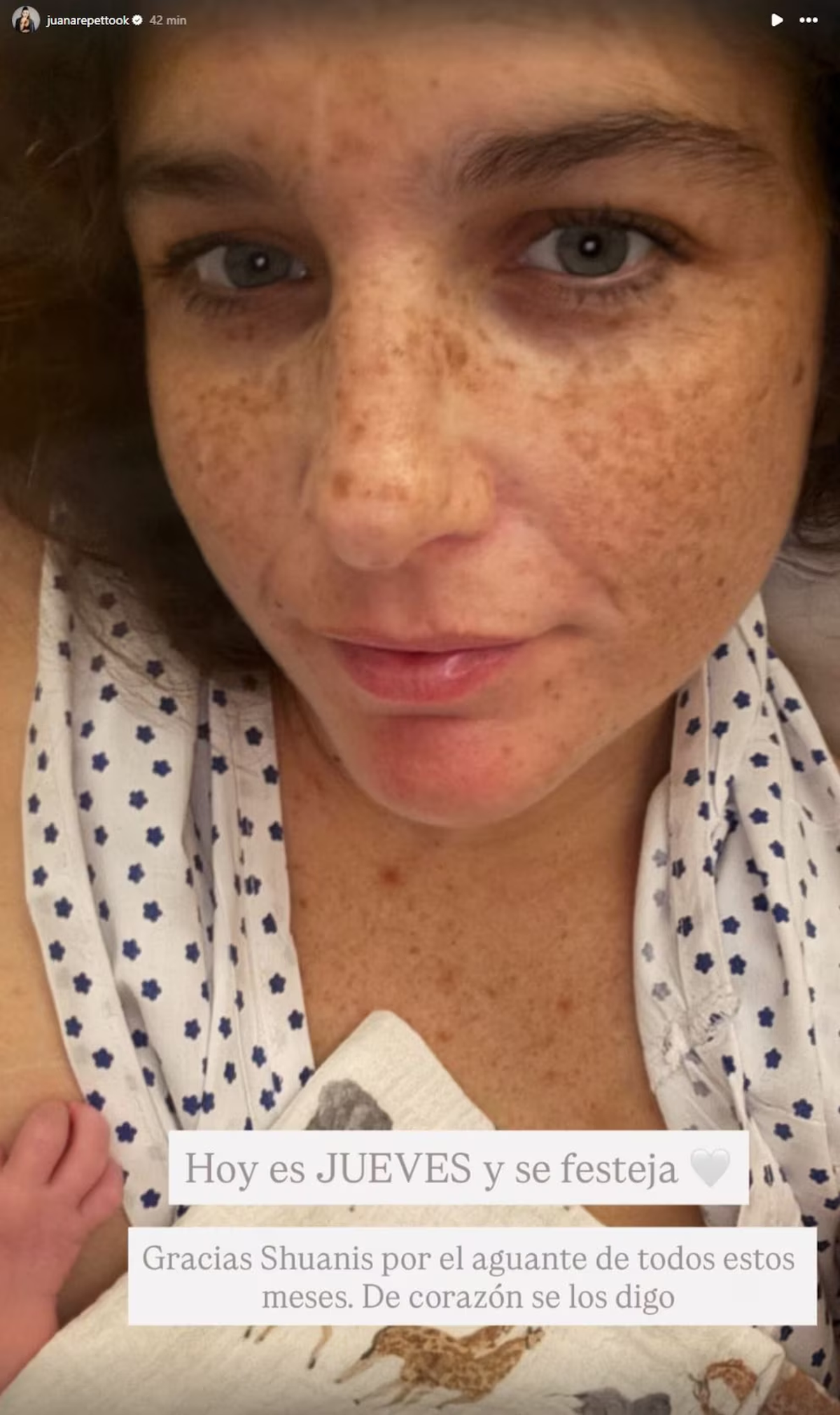 “Hoy es jueves y se festeja. Gracias Shuanis por el aguante de todos estos meses. De corazón se los digo”, escribió en una historia de Instagram en la que se la ve recostada, a cara lavada, sosteniendo al bebé en brazos. En la postal apenas se distingue la manito del pequeño, en una escena cargada de ternura y naturalidad. Sin maquillaje, con la bata de internación y visiblemente emocionada —aunque algo cansada—, Juana confirmó así la llegada de su tercer hijo.