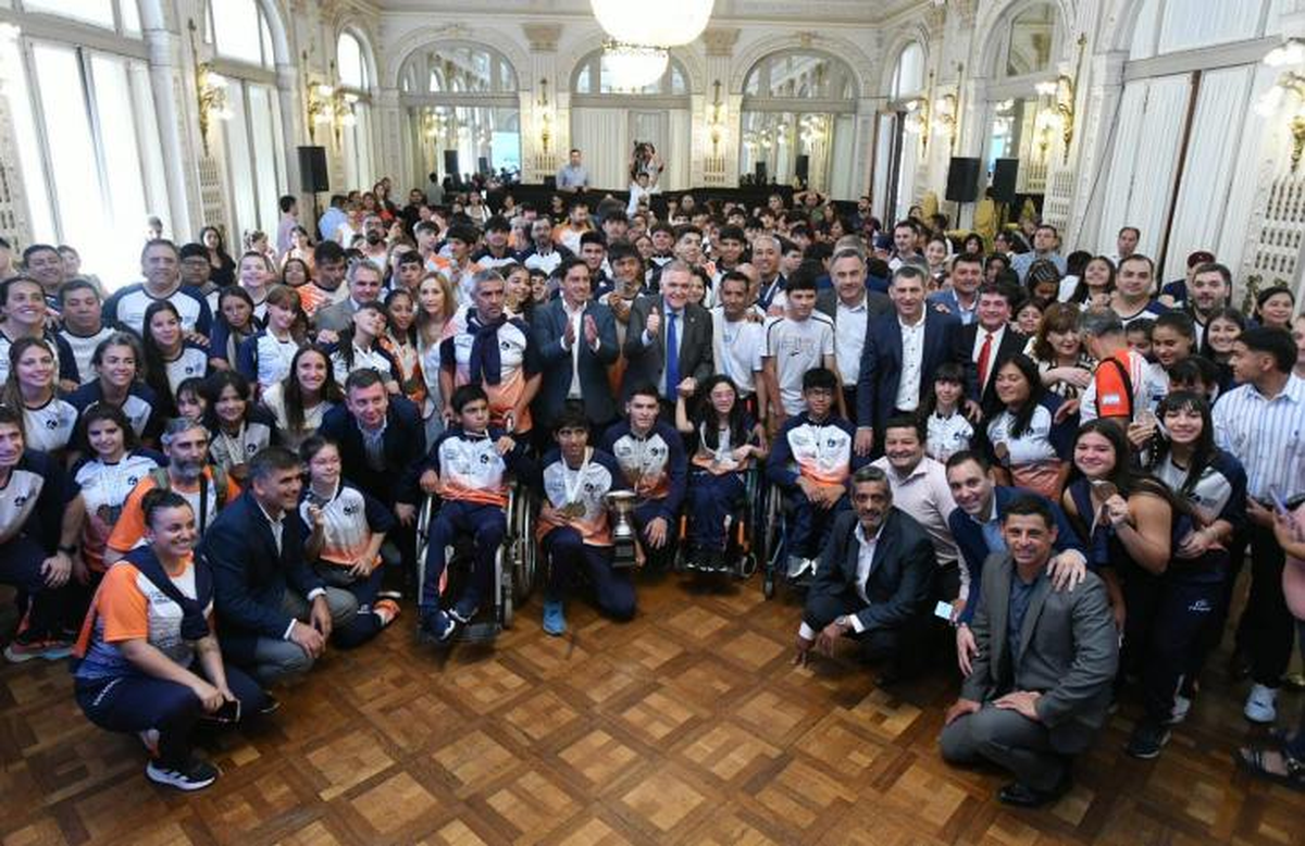 En el Salón Blanco de Casa de Gobierno, el gobernador, Osvaldo Jaldo, recibió hoy a deportistas y entrenadores que participaron de los Juegos Deportivos Nacionales Evita 2024 desarrollados del 4 al 9 de noviembre en Mar del Plata, provincia de Buenos Aires.