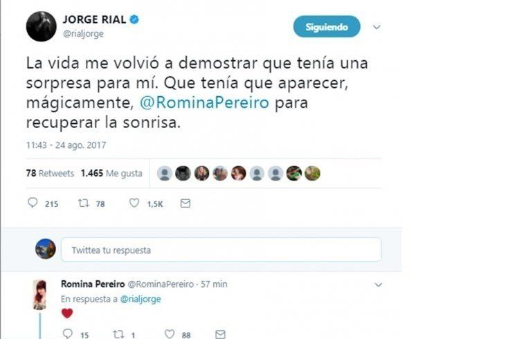 Desde Twitter, le dedicó una dulce declaración de amor a Romina: “La vida me volvió a demostrar que tenía una sorpresa para mí. Que tenía que aparecer, mágicamente, @RominaPereiro para recuperar la sonrisa”, escribió el conductor. Ella, enamorada, le respondió con un corazón.