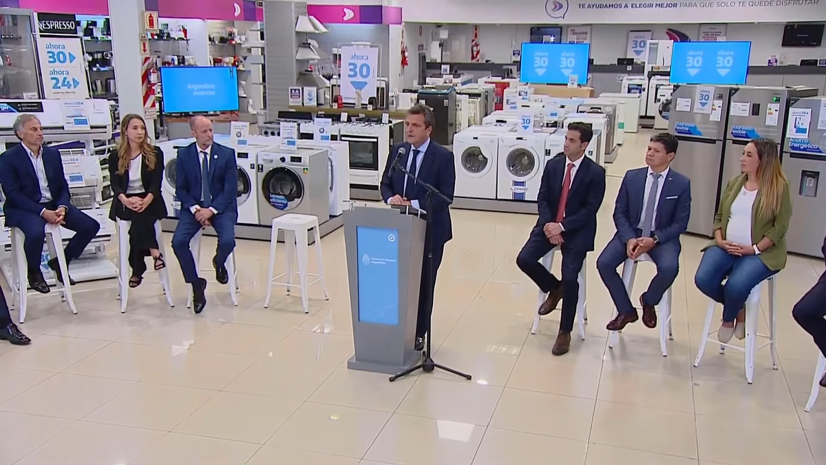 El ministro de Economía, Sergio Massa, lanzó esta tarde el programa Ahora 30 con el objetivo de fomentar el consumo y permitir a los argentinos acceder a celulares, electrodomésticos de línea blanca, aires acondicionados, entre otros artículos, a 30 cuotas con tasa fija. El plan busca contribuir a la reducción de precios: "Tenemos la tarea de bajar la expectativa inflacionaria”.