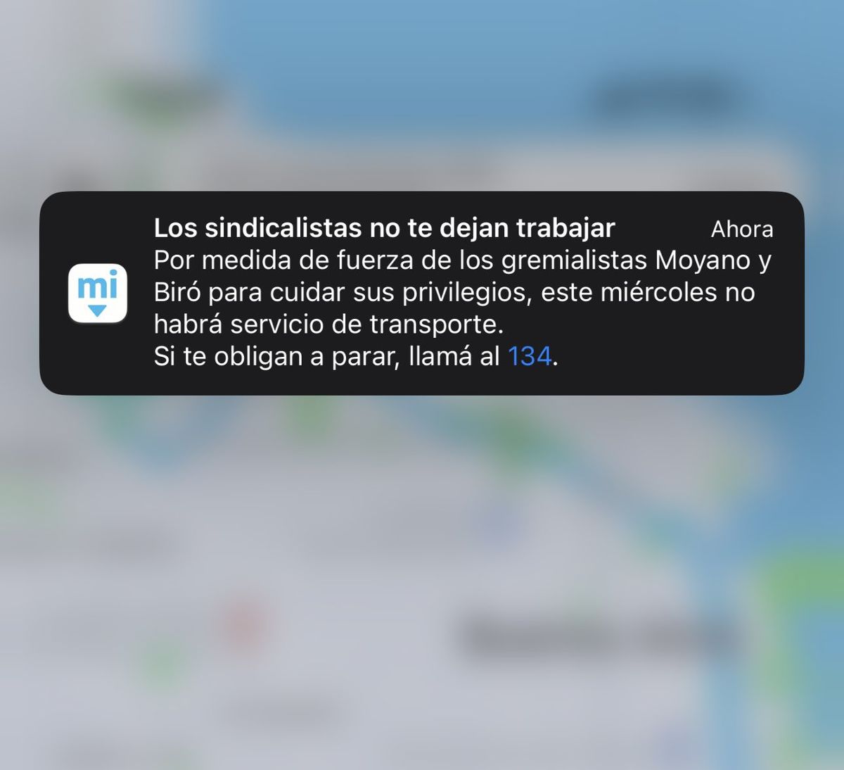 "Los sindicalistas no te dejan trabajar. Por medida de fuerza de los gremialistas Moyano y Biró para cuidar sus privilegios, este miércoles no habrá servicio de transporte. Si te obligan a parar, llamá al 134", fue el mensaje que recibieron cientos de personas en sus celulares.