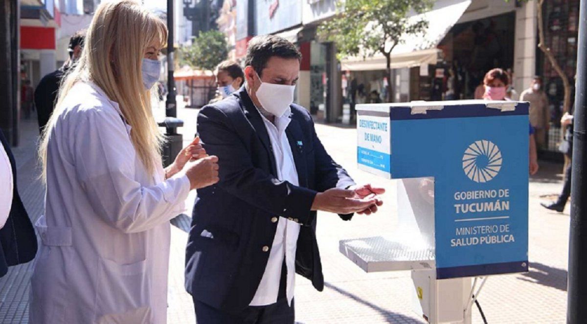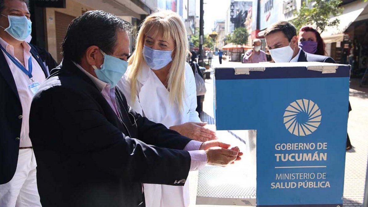 El sanitizante de manos ubicado en el microcentro de San Miguel de Tucumán contiene un bidón de 15 litros de alcohol al 70 por ciento, realizado por la Farmacia Oficial. Aunque los especialistas aseguran que lavarse las manos con jabón y agua sigue siendo la mejor opción, no está de más disponer de estos productos. Es necesario que las manos se encuentren libres de suciedad o grasa antes de la aplicación; de lo contrario, el desinfectante no hará bien su trabajo.