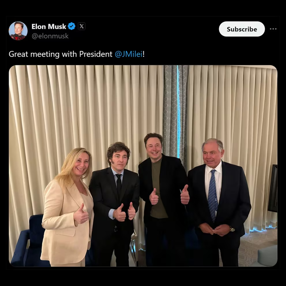 “Gran encuentro con el Presidente Milei”, posteó Musk en X, tras su encuentro con el jefe de Estado en California.