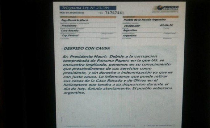Tras la información revelada por la investigación de Panama Papers que relaciona al presidente Mauricio Macri con una sociedad en un paraíso fiscal y en conmemoración por el Día del Trabajador en las redes sociales se viralizó una carta documento en donde "el pueblo" pide la renuncia del máximo mandatario.