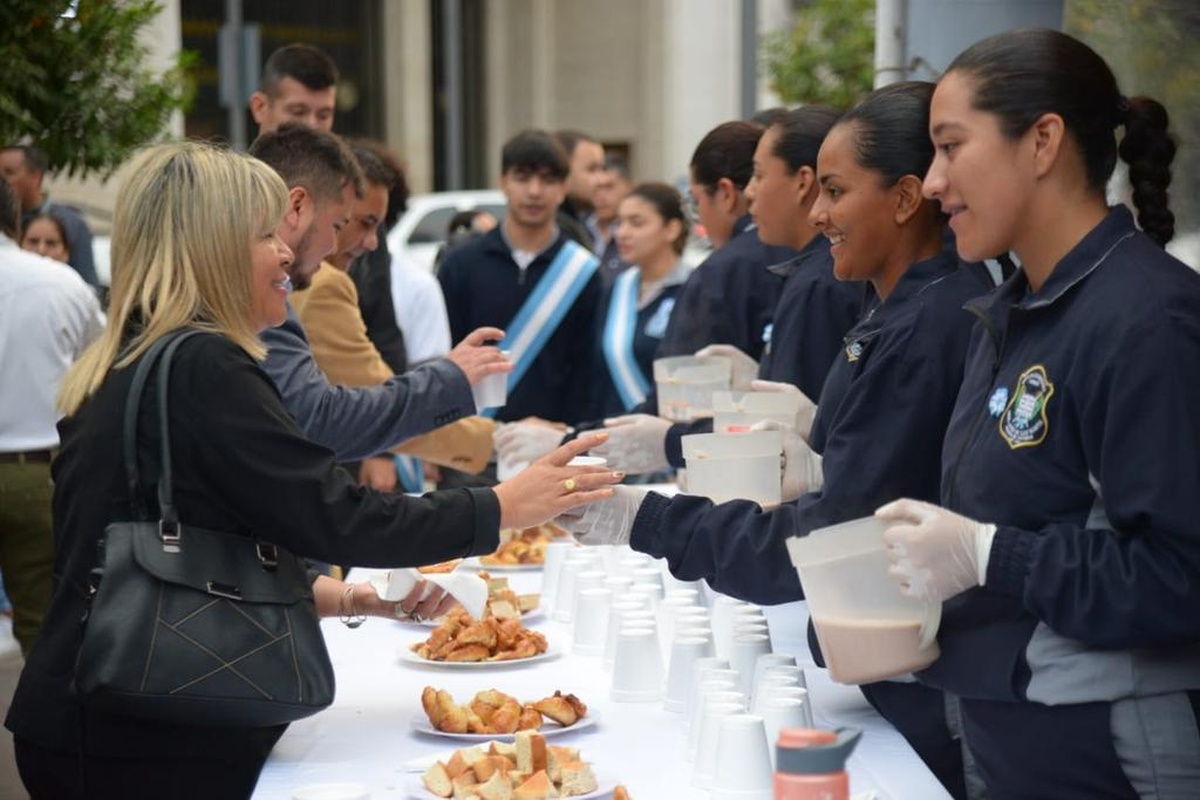 La emotiva celebración, que estuvo marcada por la presencia escolar y de vecinos y turistas, comenzó con el tradicional chocolate patrio con bollo y continuó con el izamiento de la Bandera Nacional a cargo de cadetes del Liceo Militar General Gregorio Araoz de Lamadrid.