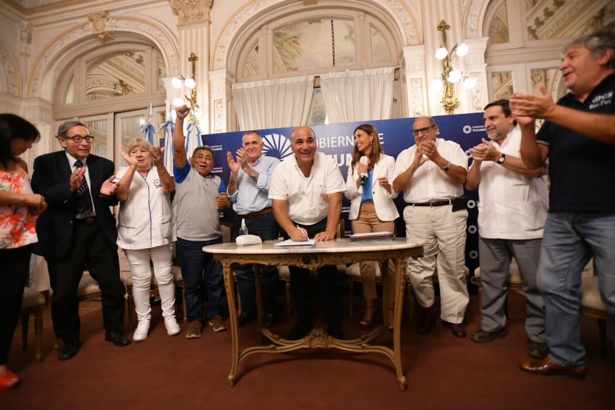 En el Salón Blanco de Casa de Gobierno se celebró el viernes pasado la firma de un importante acuerdo salarial con los trabajadores de la sanidad tucumana, que estuvo encabezada por el gobernador, Juan Manzur, el vicegobernador, Osvaldo Jaldo y los referentes de los gremios de la Salud. El porcentaje de incremento logrado en paritarias ronda el 41% en general, teniendo en cuenta la incorporación del pago de la hora extra que tienen estos trabajadores, entre otros ítems; destacándose también la firma del proyecto de Ley de la Carrera Sanitaria.