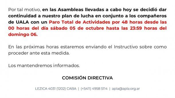 Los pilotos de Aerolíneas Argentinas y Austral anunciaron este lunes un paro total de 48 horas que comenzará a las 0 del sábado 5 de octubre y finalizará a las 0 del lunes 7 en reclamo de la apertura de paritarias.