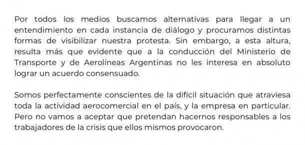 La medida de fuerza fue anunciada por APLA, el gremio mayoritario de los pilotos de Aerolíneas Argentinas, pero en conjunto con los compañeros de UALA , es decir que los pilotos de Austral también van a adherir.
