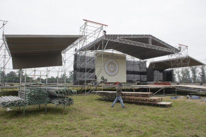 Ayer se levantaba un escenario central de casi 43 metros de largo, que tendrá dos niveles, en uno se oficiarán las grandes misas y en otro se realizarán los actos culturales. Las señoras del Garden Club preparan los diseños ornamentales con flores y frutos de la región, como cañas de azúcar, limones y flores de vivos colores, adelantó Adriana Rossi, secretaria ejecutiva del comité organizador. A ambos lados del gran escenario habrá dos escenarios más pequeños, uno para la prensa y otro para el coro. También se construye la Ciudad Eucarística, similar a una exposición de la Iglesia.