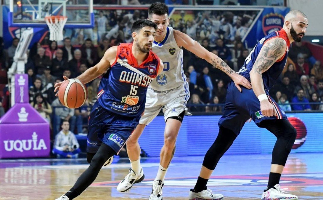 En el segundo parcial, la tónica del encuentro siguió bajo el mando de los santiagueños (36-19), que no se resintieron con la segunda unidad en cancha y estremecieron el aro con las conversiones de larga distancia de Franco Baralle y Agustín Pérez Tapia. A falta de tres minutos para el cierre de la primera mitad, y con un bajo porcentaje en triples, Franco Balbi cortó la sequía boquense con un lanzamiento lejano para descontar con un parcial de 7-0, que pudo extenderse, pero Marcos Mata no pudo convertir. En la réplica, Quimsa reaccionó con una bandeja de Juan Brussino, y un bombazo de Mauro Cosolito y un doble debajo del aro de Sebastián Acevedo al filo de la bocina para dejar a su equipo con una ventaja de 43-28.