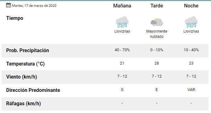 Según el sitio oficial del Servicio Meteorológico Nacional (SMN), este martes se espera una mínima de 18° y una máxima de 28°. Durante la mañana se esparan lloviznas dispersas, mientras que por la tarde el cielo estará mayormente nublado, con ascenso de temperatura, lo que producirá que a la noche reaparezcan la posibilidad de chaparrones aislados.