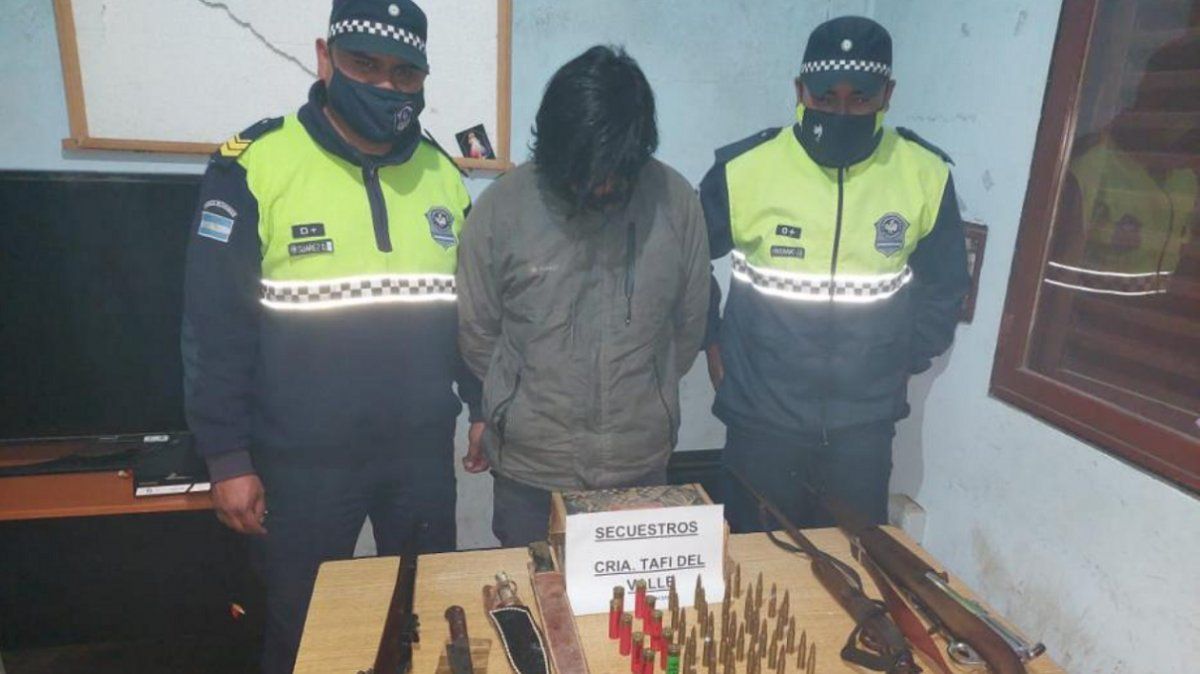 Durante el operativo, los agente encontraron al atacante en inmediaciones de la vivienda. Al revisar la casa, los policías secuestraron en el dormitorio de su hijo las siguientes armas sin documentación: Un fusil Mouser modelo argentino 1891, una escopeta Centauro calibre 16, un fusil Herstal Belgique, una pistola de aire comprimido calibre 177/4.5 mm marca Gamo, 37 proyectiles calibre 308 y 7,62, 10 cartuchos calibre 16 marca Orbea y dos cuchillos tipo puñal.